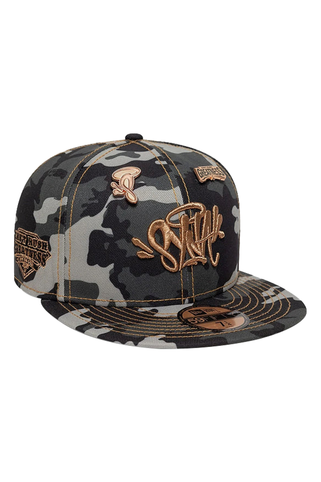 Elevate your streetwear game with the Central Cee x New Era Syna 59FIFTY Fitted Camo Hat. This exclusive cap features a bold black camo design complemented by eye-catching rose gold embroidery. Combining iconic New Era craftsmanship with Central Cee’s signature Syna World aesthetic, this fitted cap is a stylish and standout piece for any wardrobe.