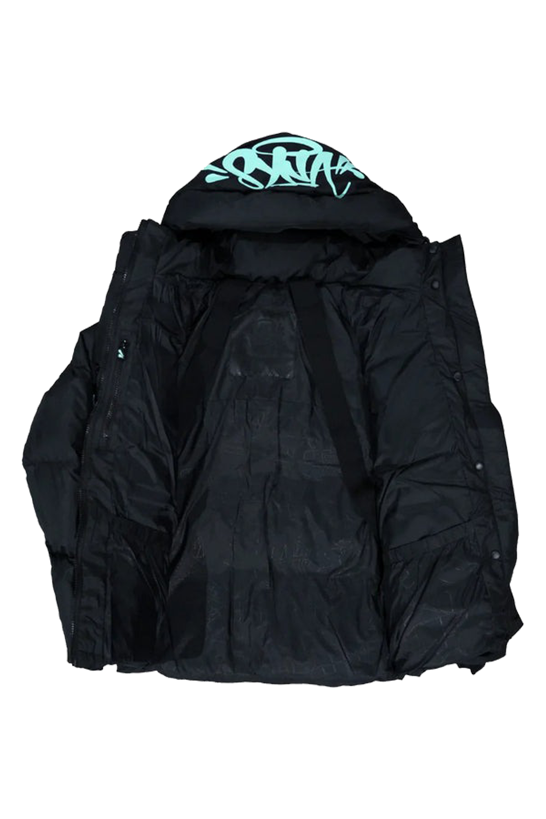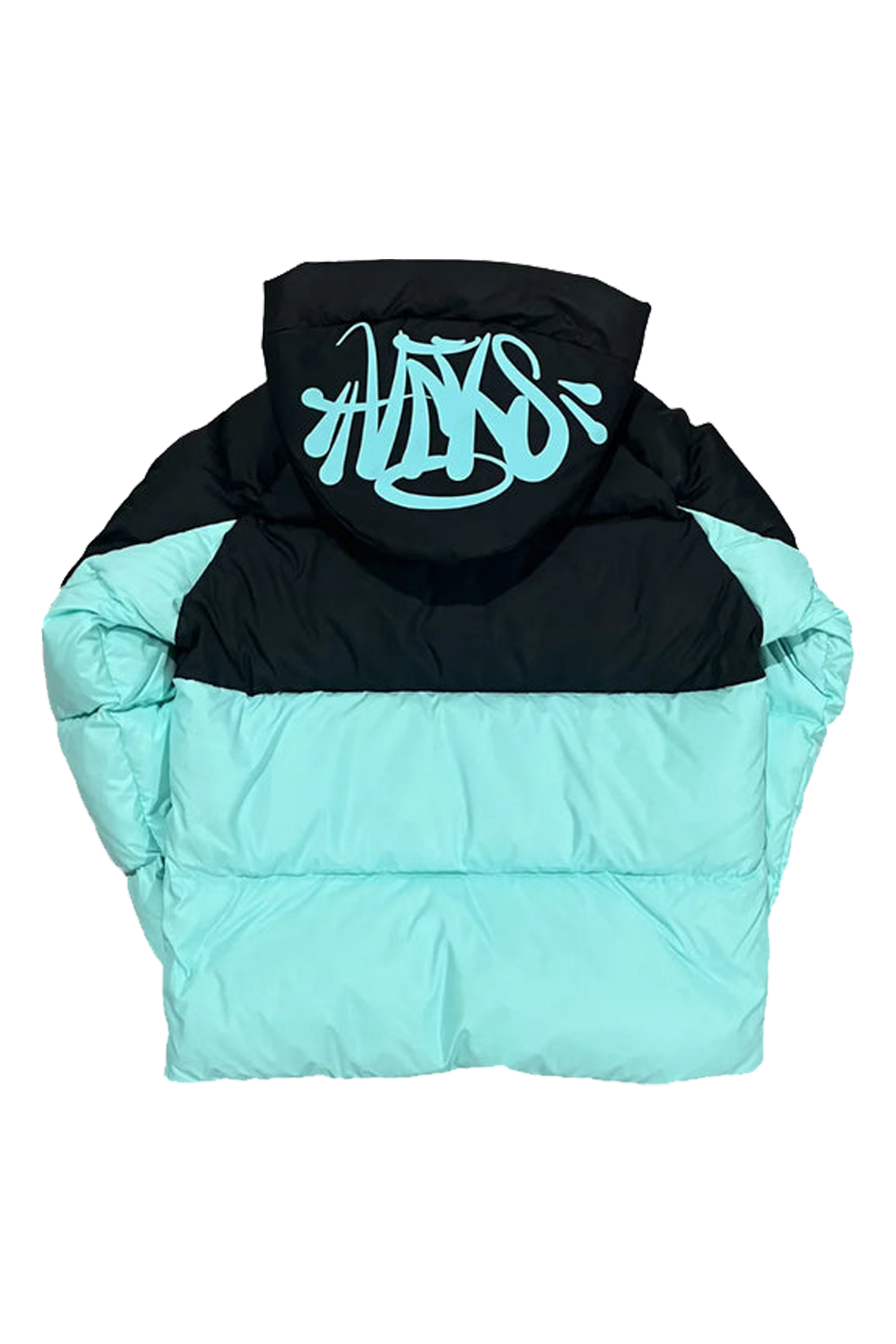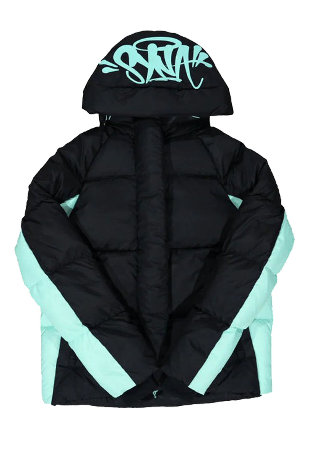 The official SYNA world logo puffer jacket in sky blue and black will draw attention and keep you warm. This striking piece blends vibrant urban energy with aspects of road fashion. Designed by Sina World and inspired by the UK Rap Sensation Central CEE, this unique jacket offers high-demonstrations as a necessary piece of outerwear, capturing the essence of roads.